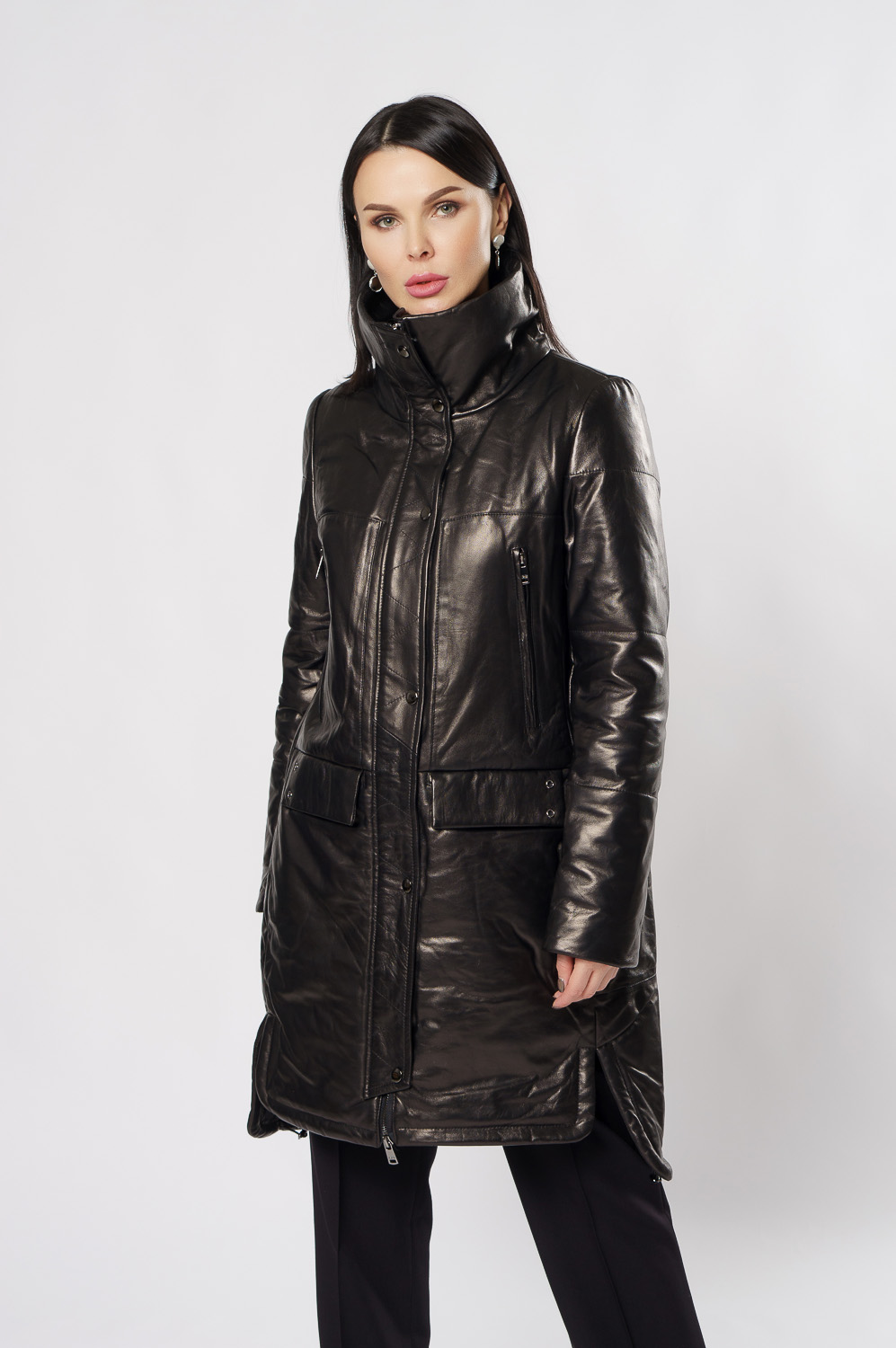 Удлиненный пуховик из натуральной кожи обеспечит тепло и