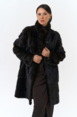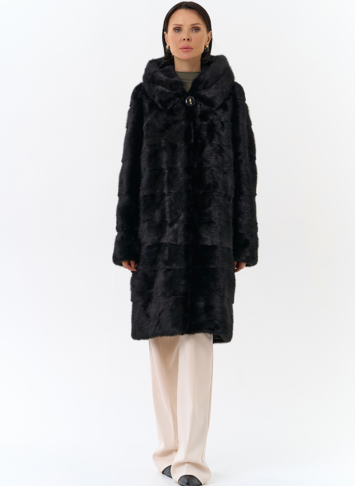 Шуба из меха норки черного цвета. Изделие средней длины, но его можно укоротить, как и рукава. Застегивается с помощью шубных крючков и пуговицы. Модель прямого фасона и дополнена объемным капюшоном. Раскладка меха - поперечные пластины. Подклад из полиэстера износоустойчив и позволяет носить шубу долгое время. Модель сочетается как с брюками, так и с юбками.